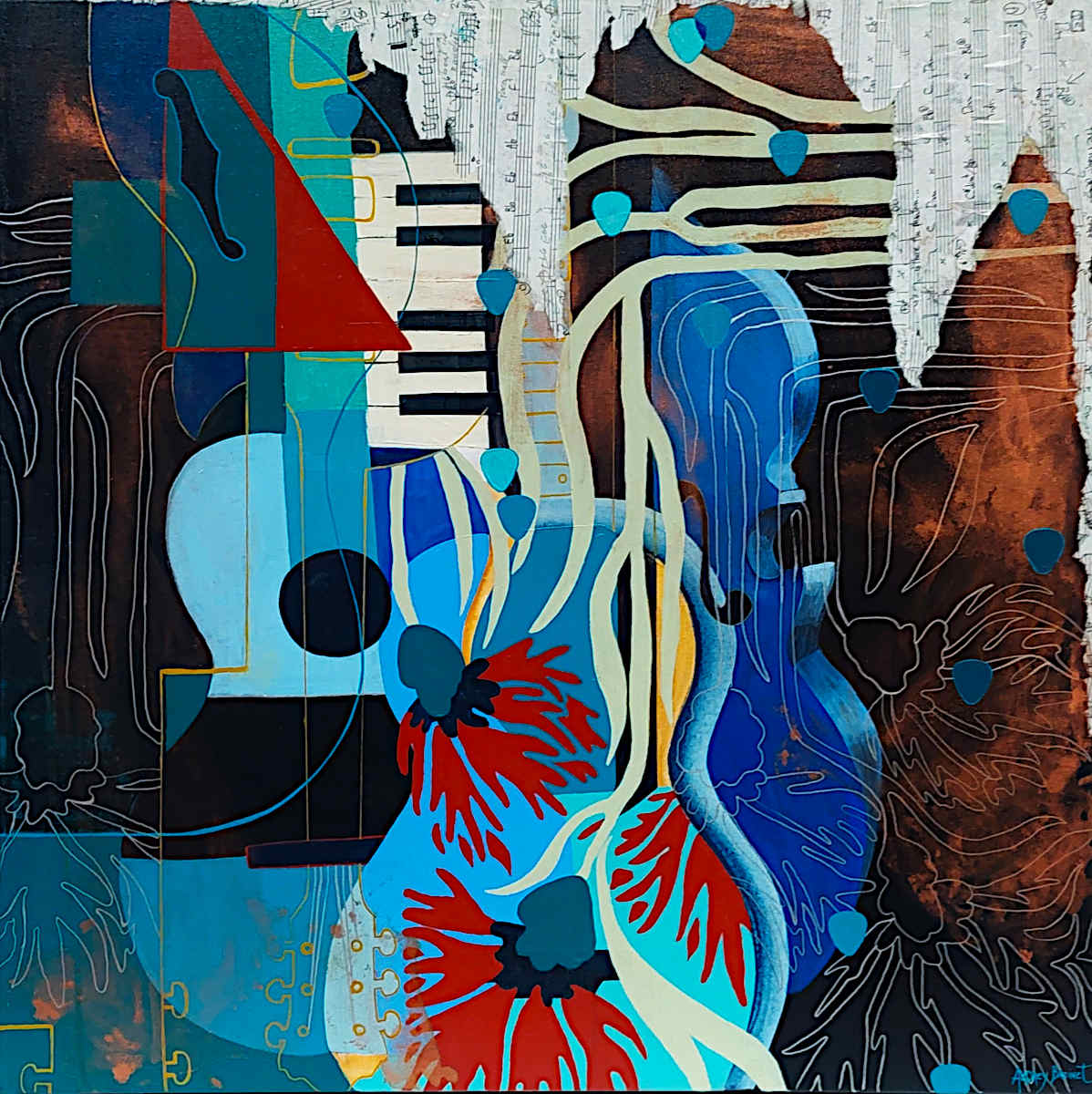 Original acrylic painting on canvas by Audrey Bazinet - abstract, musical and floral themes, mixed media, collage, metallic paints.