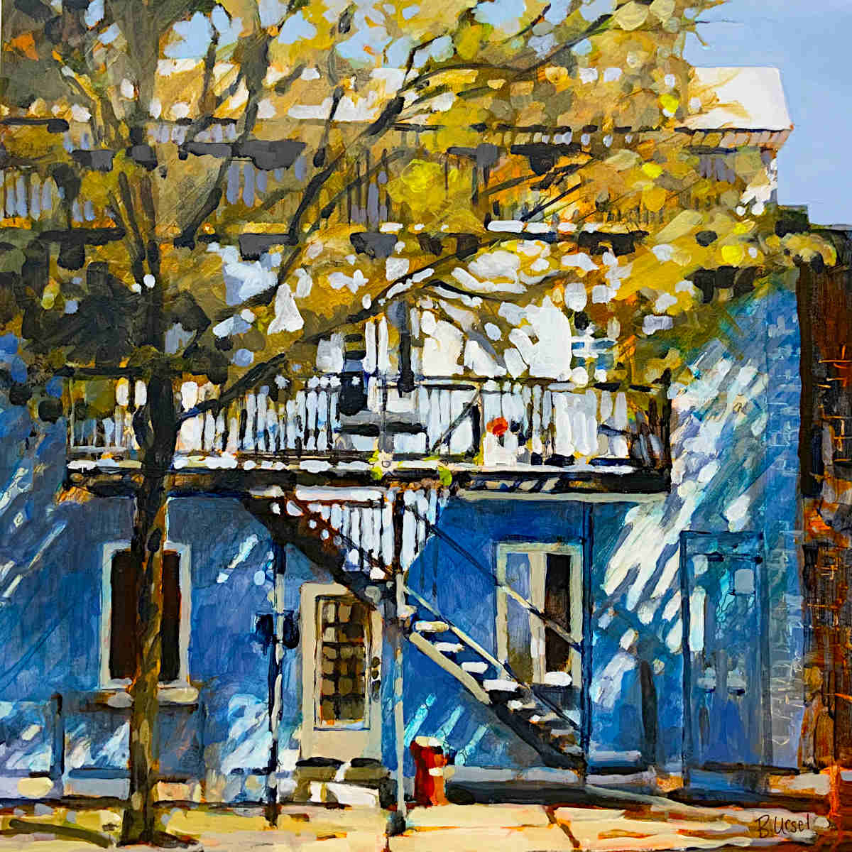 Original acrylic painting on canvas by Barbara Ursel - street scenes of Montreal's neighbourhoods, light and shadows cast over buildings.