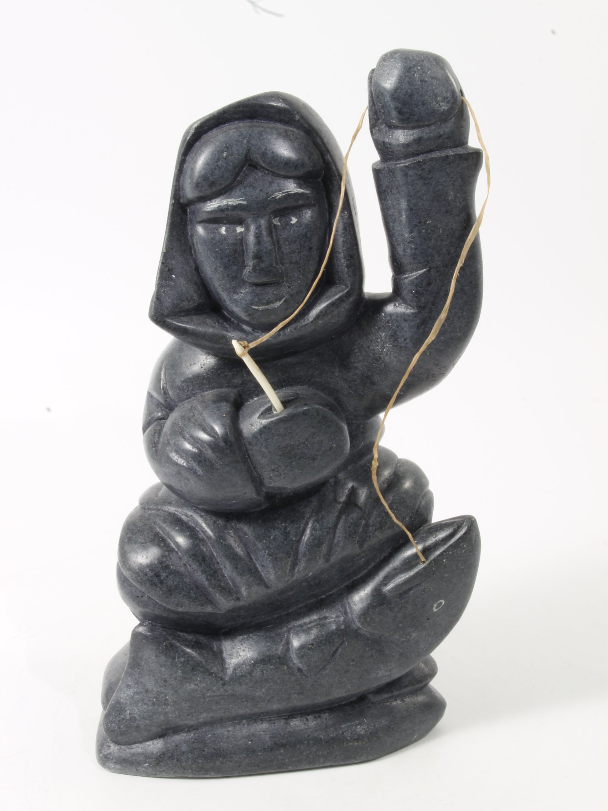 Soapstone carving with whale bone and string by Pita Pirti, from the Akulivik community in Nunavik, figurative sculpture, Inuit art.