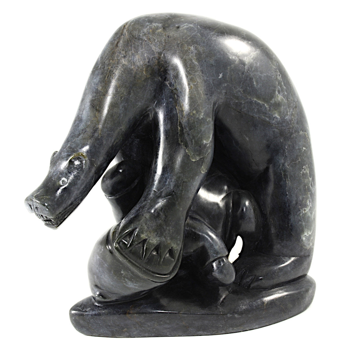 Soapstone carving with whale bone by Samson Kingalik, from the Inukjuak community in Nunavik, figurative sculpture, Inuit art.