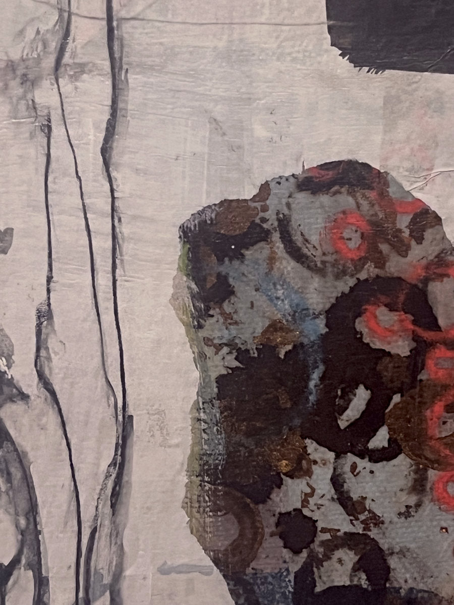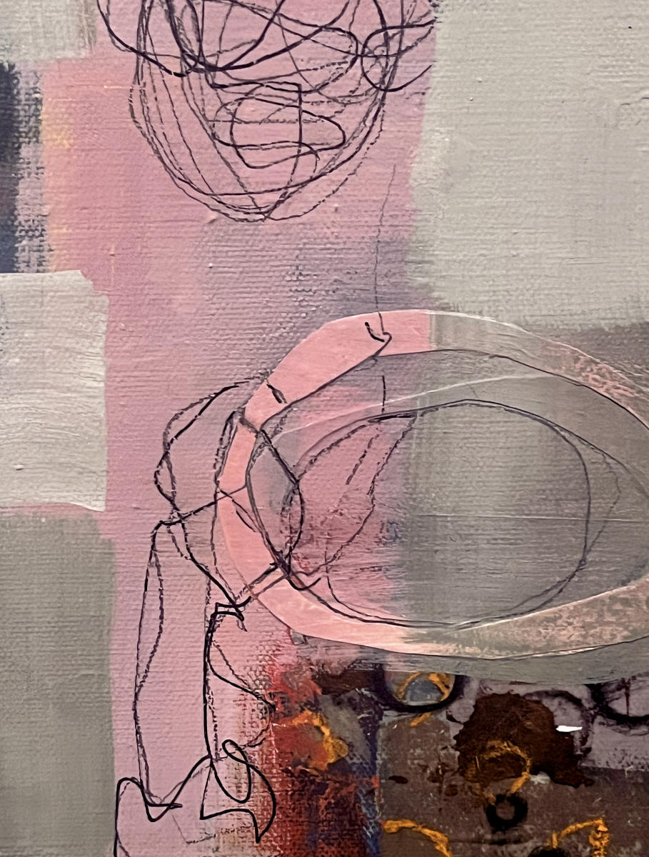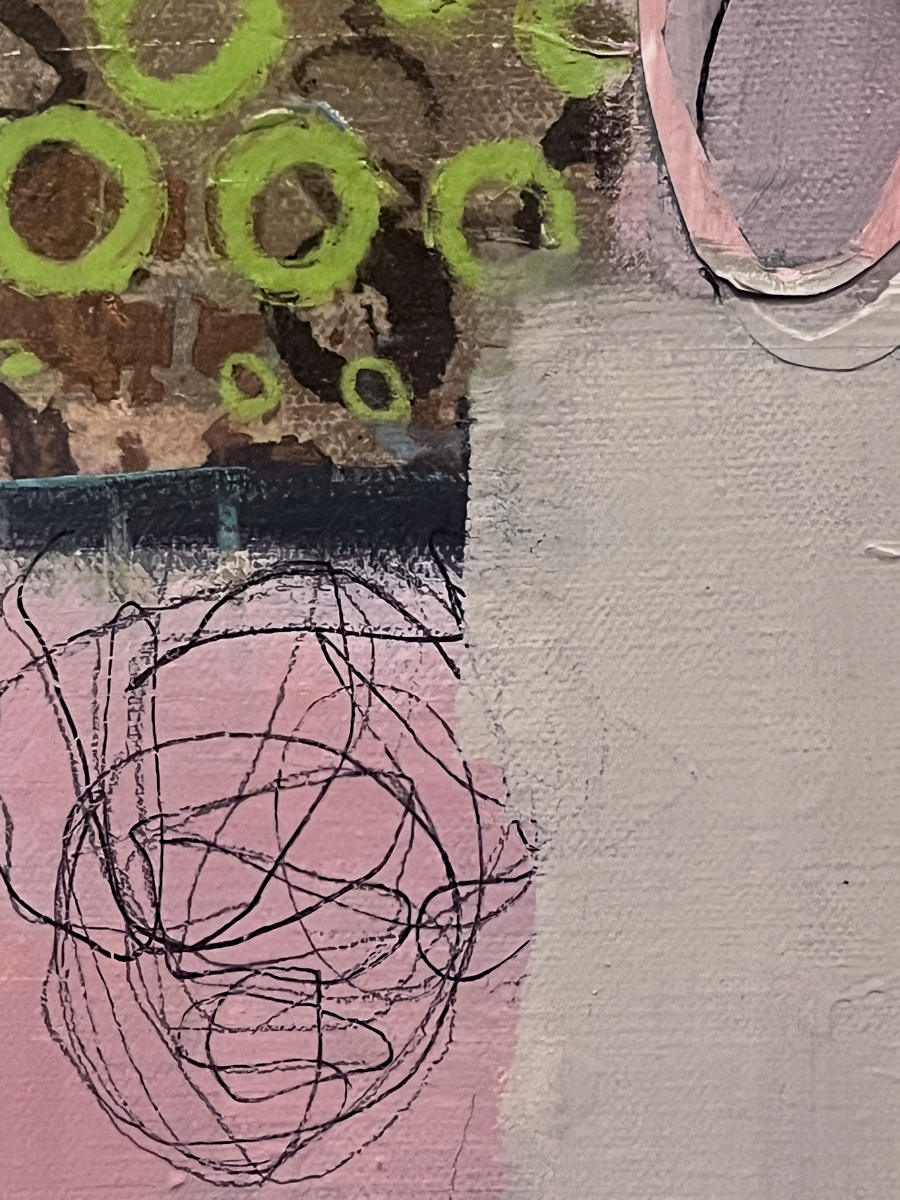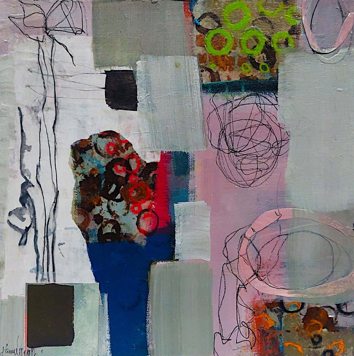 Original acrylic painting on canvas by Karen Wynne Mackay - contemporary abstract floral artist, collage layers, mixed media surfaces, calligr...